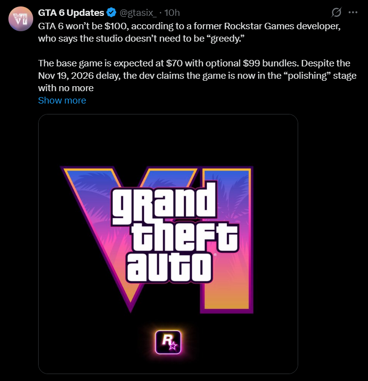 "Mike York" who is an 'Ex-Rockstar Animator' directly dismissed the idea of a $100 base price for GTA 6. He said that Rockstar doesn’t need to be "greedy" because they will likely sell massive volumes even at the standard $70 price. He even suggested if Rockstar does charge near $99 for a special pre-order bundle, it would include additional perks (GTA Online bonuses), but the base game itself should stay at the lower price.