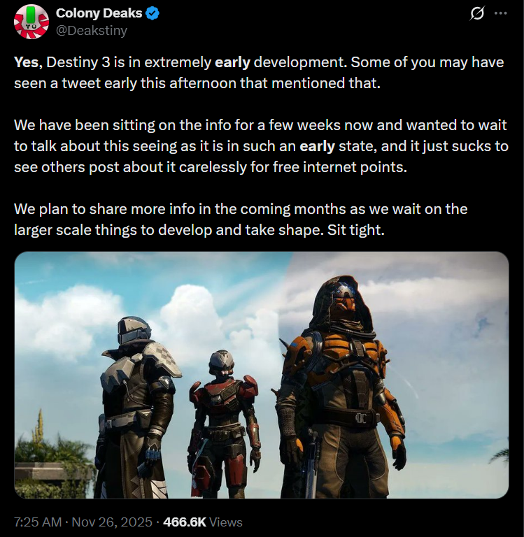 Colony Deaks claims they’ve had the info for a few weeks, but waited to speak publicly until they felt the project had passed its earliest internal tipping point. More details, they say, could emerge in "coming months". Multiple gaming news outlets also picked up and repeated the claim, including reputable sites like PCGamesN, The Game Post, Push Square, Pure Xbox, and others. The leak appears to come at a moment when the studio’s publicly disclosed workload is otherwise full, the upcoming shooter 'Marathon' is slated for release in 2026, and support for the current 'Destiny 2' continues.