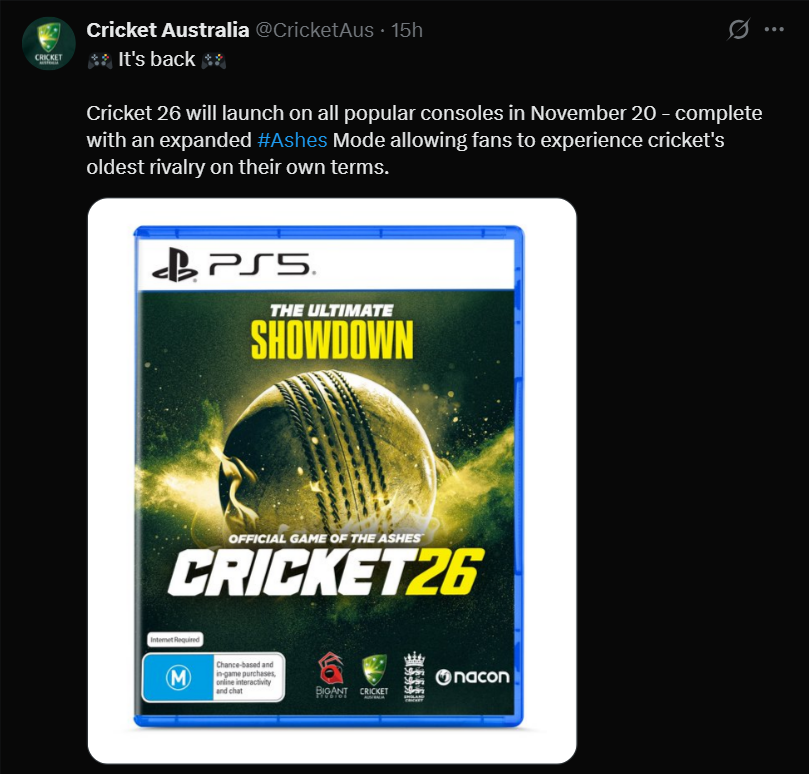 There's good news for the gaming and sports community as the popular game "Cricket 26" is officially returning, with a launch announced for November 20, 2025, on all major popular consoles. By the way, this announcement came via a post by "Cricket Australia", they were teasing an "expanded #Ashes Mode" so that players can relive and reshape perhaps the greatest rivalry in cricket history that is "Australia vs England" (most prominent contenders for the greatest rivalry in cricket history) through the lens of a video game. The developers are now promising the richer features, deeper immersion, and more strategic control over the matches, especially in "Ashes Mode". As most of Cricket fans know how 'Ashes rivalry' is famous among cricketing nations and after this news, we can assume that the marketing is clearly aimed at capturing both nostalgia and the attention of new audiences. I would say that this relaunch is a significant deal, as it signals renewed investment in the sport’s digital side and gives fans hope for more realism, better modes, and an improved experience in future compare to previous titles.