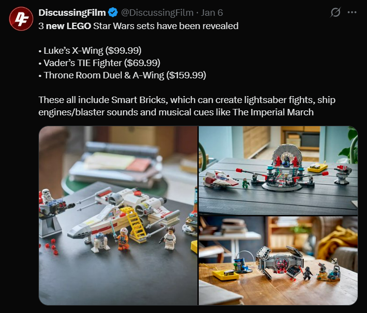 LEGO Smart Play™ was first officially announced on January 5, 2026, at the Consumer Electronics Show (CES) in Las Vegas. Currently, a total of 3 LEGO Smart Play™ sets are available as for pre-order and will be fully released on March 1, 2026. The first, SMART Play: Darth Vader's TIE Fighter (75421), contains 473 pieces and is priced at $69.99, the second, SMART Play: Luke's Red Five X-wing (75423) which contains 584 pieces and is priced at $99.99, and lastly, SMART Play: Throne Room Duel and A-wing (75427) which contains a total of 962 pieces and can pre-ordered for $159.99.
