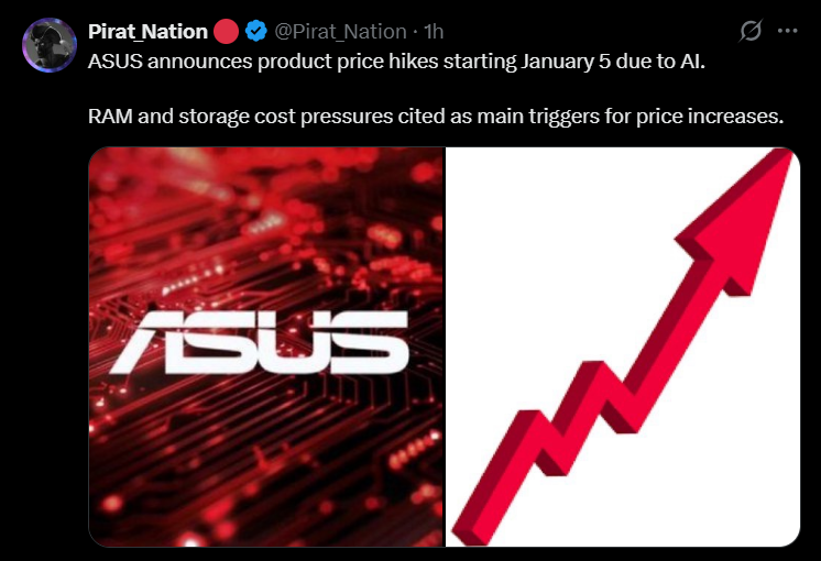 Now this issue is slowly affecting several Gaming and Tech companies. Among the most talked-about claims is that NVIDIA’s flagship GPU, the RTX 5090, could see its price rise from around $1,999 MSRP to as much as $5,000 next year due to soaring DRAM/GDDR costs and supply issues. On the other hand, Gaming company like ASUS, has officially announced that it will raise its product prices starting at January 5, 2026, pointing directly to cost pressures on RAM and storage components, which are largely driven by the demand from the AI sector.