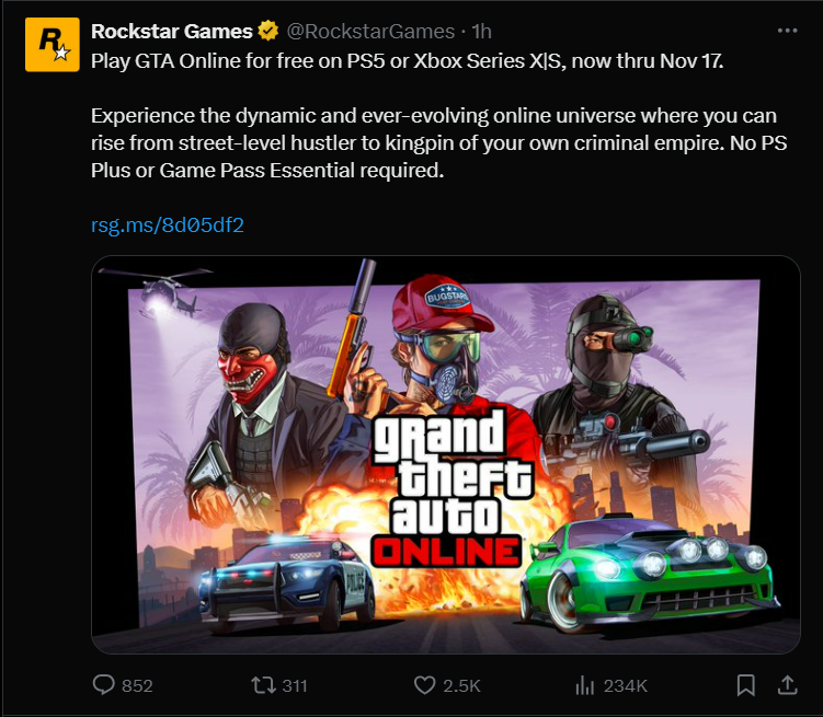 On November 11, Rockstar posted a limited-time promotion on their Twitter handle that lets players on PlayStation 5 and Xbox Series X|S access GTA Online without needing a paid online subscription (no PS Plus or Game Pass Essential required) for the promotional window. This promotion maybe aimed at bringing more players into the online ecosystem, allowing newcomers try the multiplayer experience and long-time players re-engage without the friction of a required platform subscription. The trial window runs through November 17, and it applies to the next-gen versions of GTA Online on those consoles — the enhanced releases made to take the advantage of faster loading, improved visuals, and online features tuned for newer hardware.